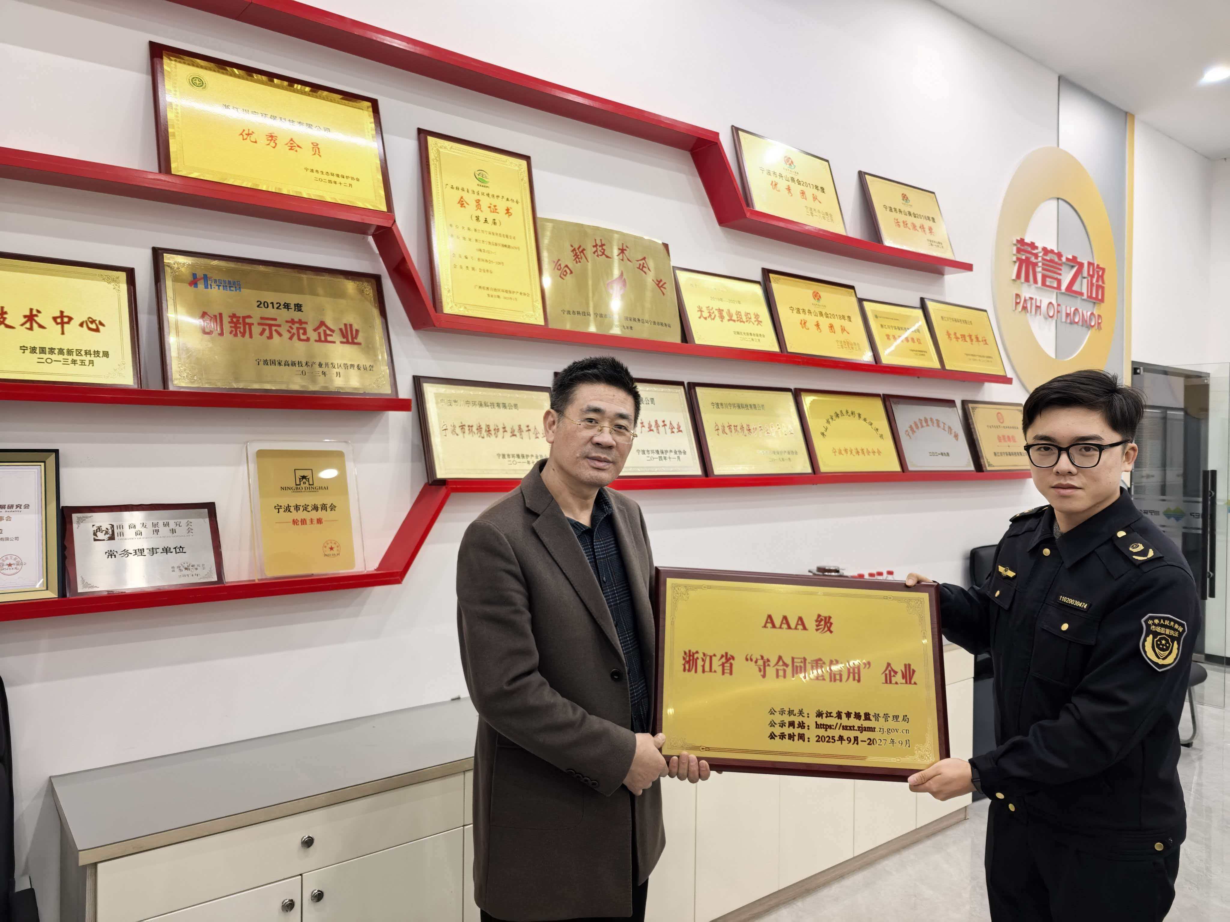 12月24日,寧波市高新區(qū)市場(chǎng)監(jiān)督管理局領(lǐng)導(dǎo)蒞臨浙江川寧環(huán)保科技有限公司,向我司頒發(fā)—浙江省AAA級(jí)“守合同重信用”榮譽(yù)牌匾。